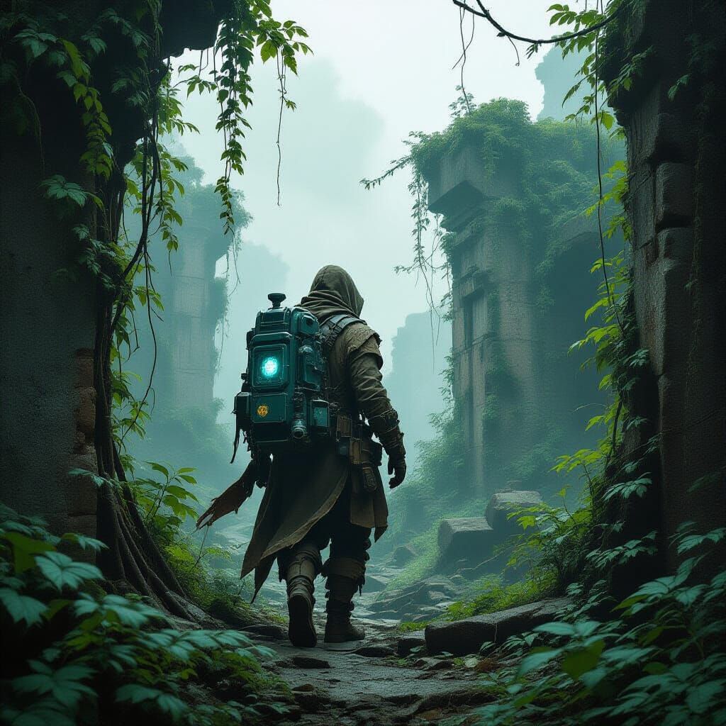 This image shows a lone explorer traversing the ruins of a forgotten civilization overtaken by nature. The scene is rendered in a gritty, hyper-realistic style with biomechanical elements and a post-apocalyptic aesthetic.