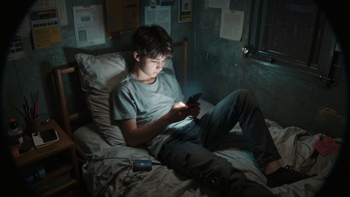 A hyperrealistic image shows a teenager engrossed in their phone in a confined, messy room. Cinematic lighting and a fisheye effect create a dystopian mood, rendered with Unreal Engine 5.