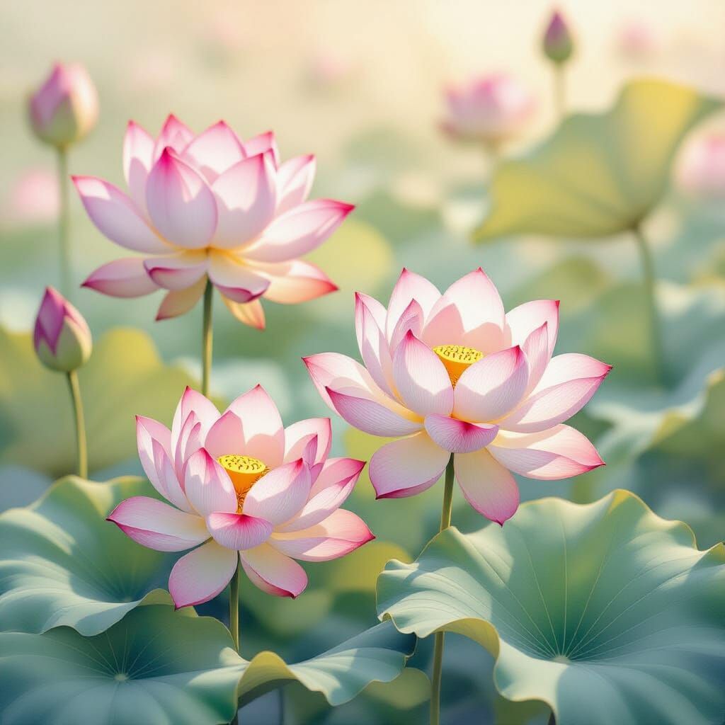 This image shows a close-up of lotus flowers in full bloom, rendered in a watercolor style with blended pinks and greens. The artwork features intricate details and warm golden lighting.
