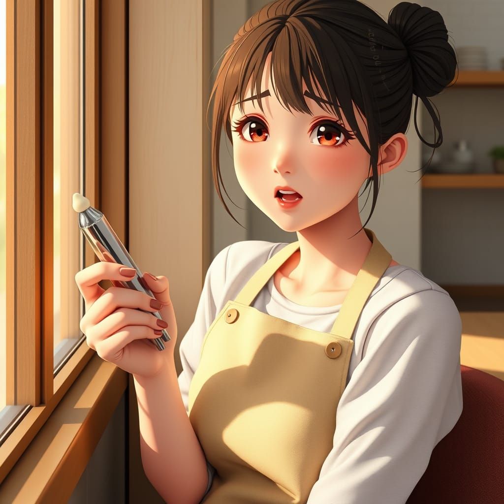 A cute Asian pastry chef with a playful, guilty smile sits by a sunny window, holding a piping tip. Features warm, realistic anime style with cinematic lighting.