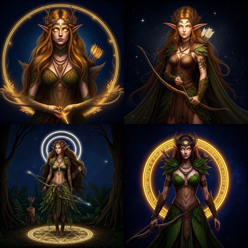 This image shows a magical elf archer silhouetted against a starry night. The elf's armor is decorated with natural elements, and she is surrounded by a glowing halo. She holds a bow and arrow, ready to combine magic and archery.