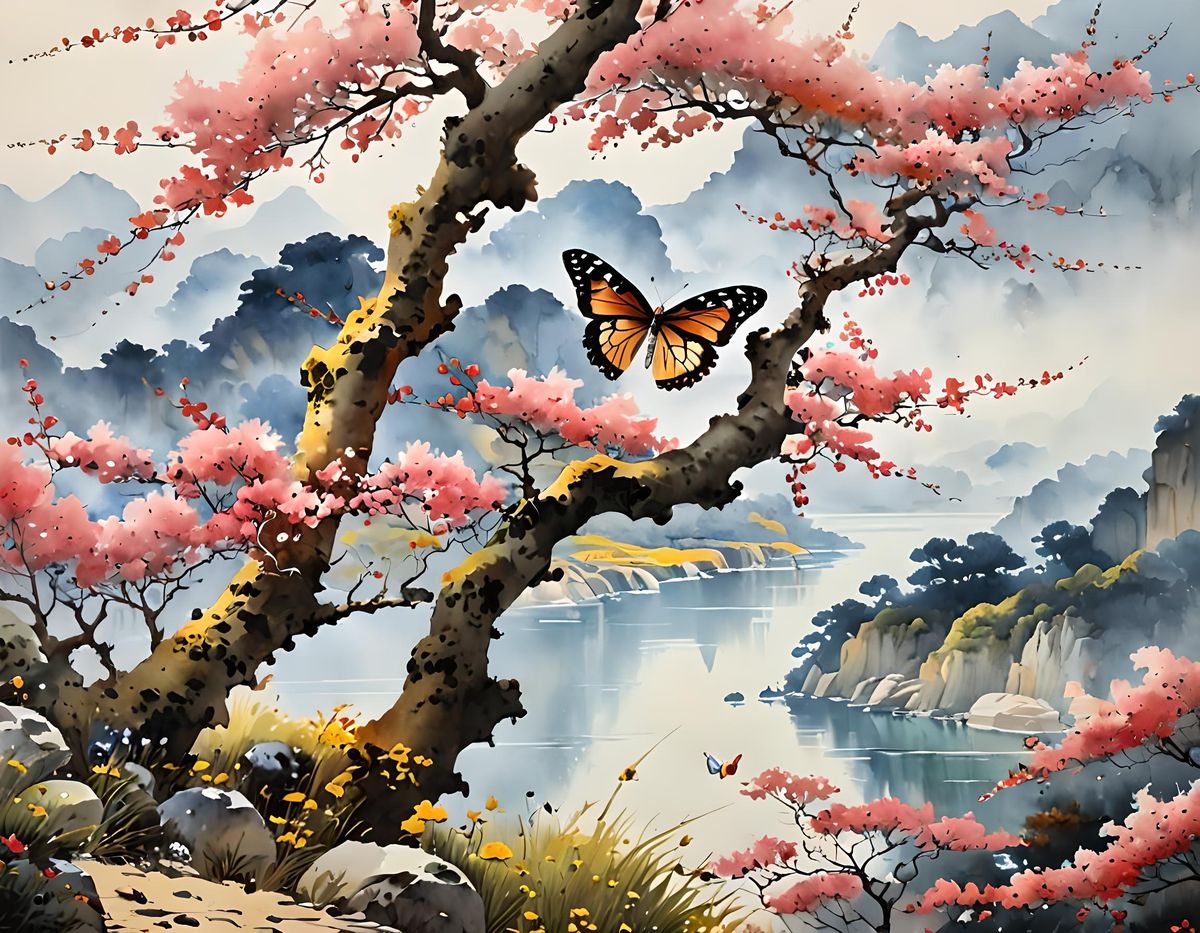 This image shows painted-lady butterflies near a tree by a lake. The watercolor painting features mythical floral hills and large opaque blossoms in a modern European ink style.