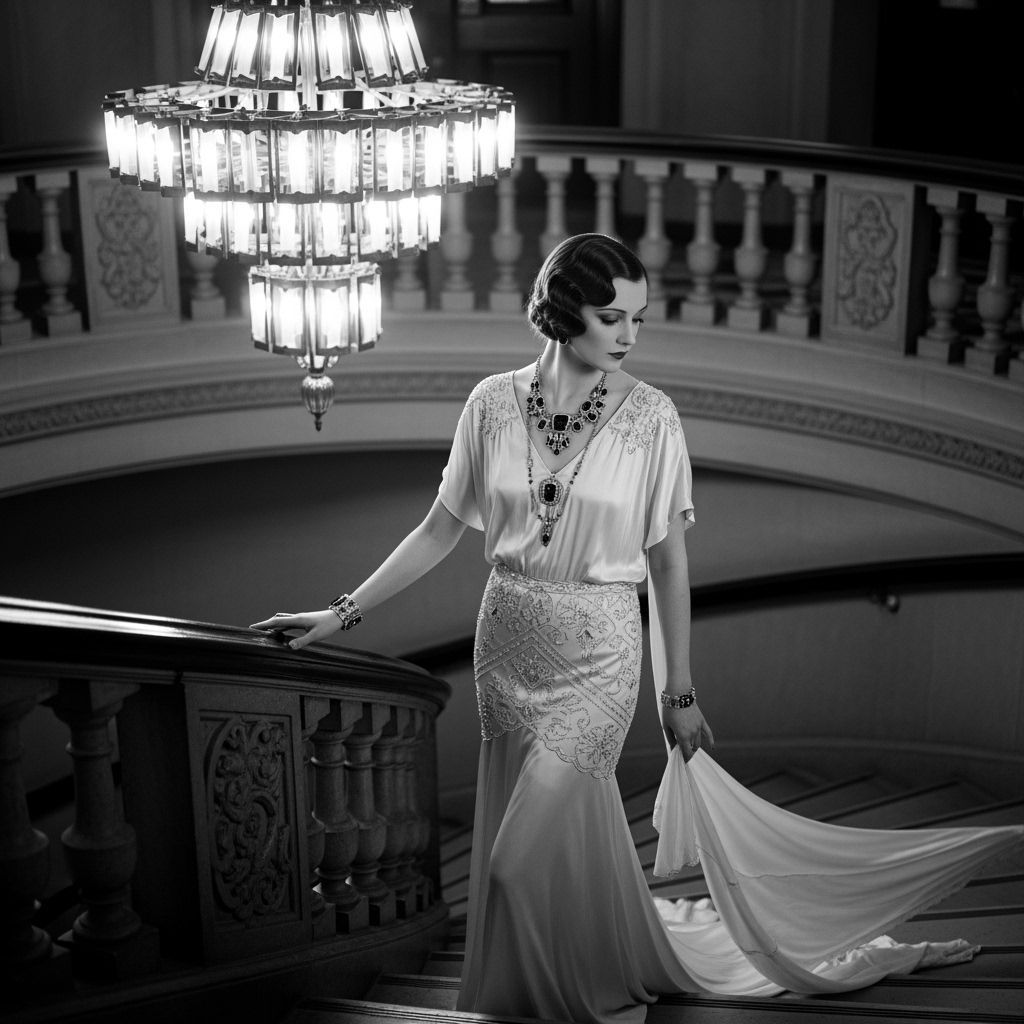 A black and white image of a woman in a pearl gown walking down a spiral staircase. The image evokes the glamour of 1920s fashion photography.