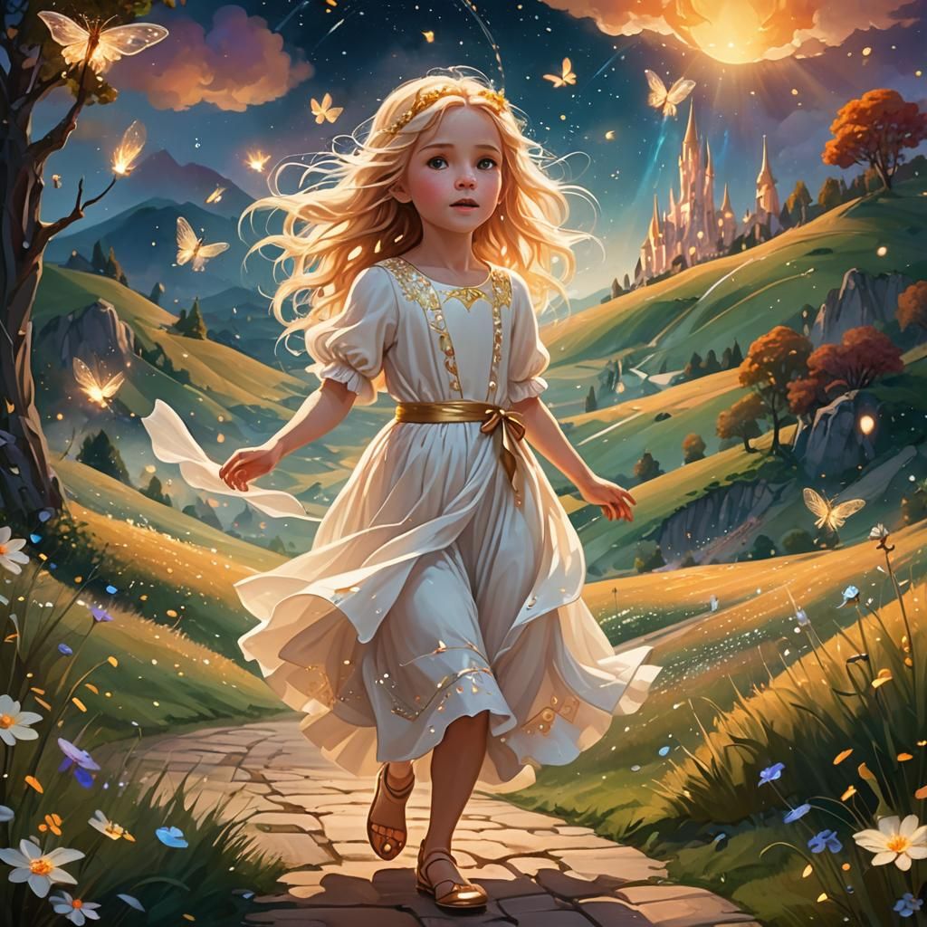 A vibrant image of a girl running through a dreamscape. Rolling hills and crystal towers fill the land, illuminated by glowing fireflies. The artwork is rendered with soft brushstrokes in an impressionist style.