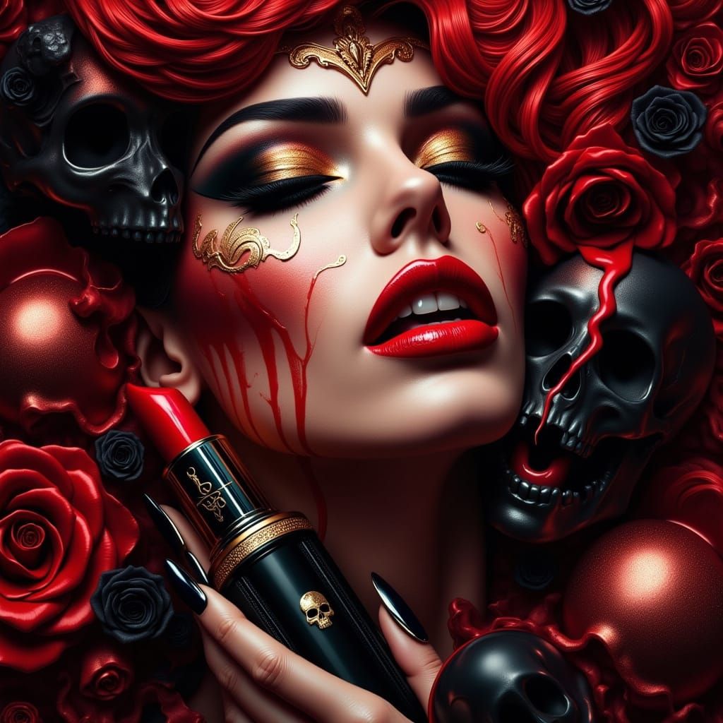 A close-up of a stunning woman with blood red hair and gold serpent eyes, set against a backdrop of black and crimson smoke, featuring a bold, hyper-realistic, pulp comic aesthetic with skulls and roses.