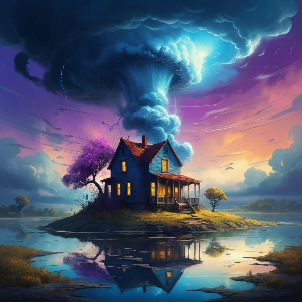 This oil painting captures a surreal floating island with a ruined house and swirling tornado. Ethereal brushstrokes illuminate a nebulae-filled sky, creating a dreamlike fantasy atmosphere.