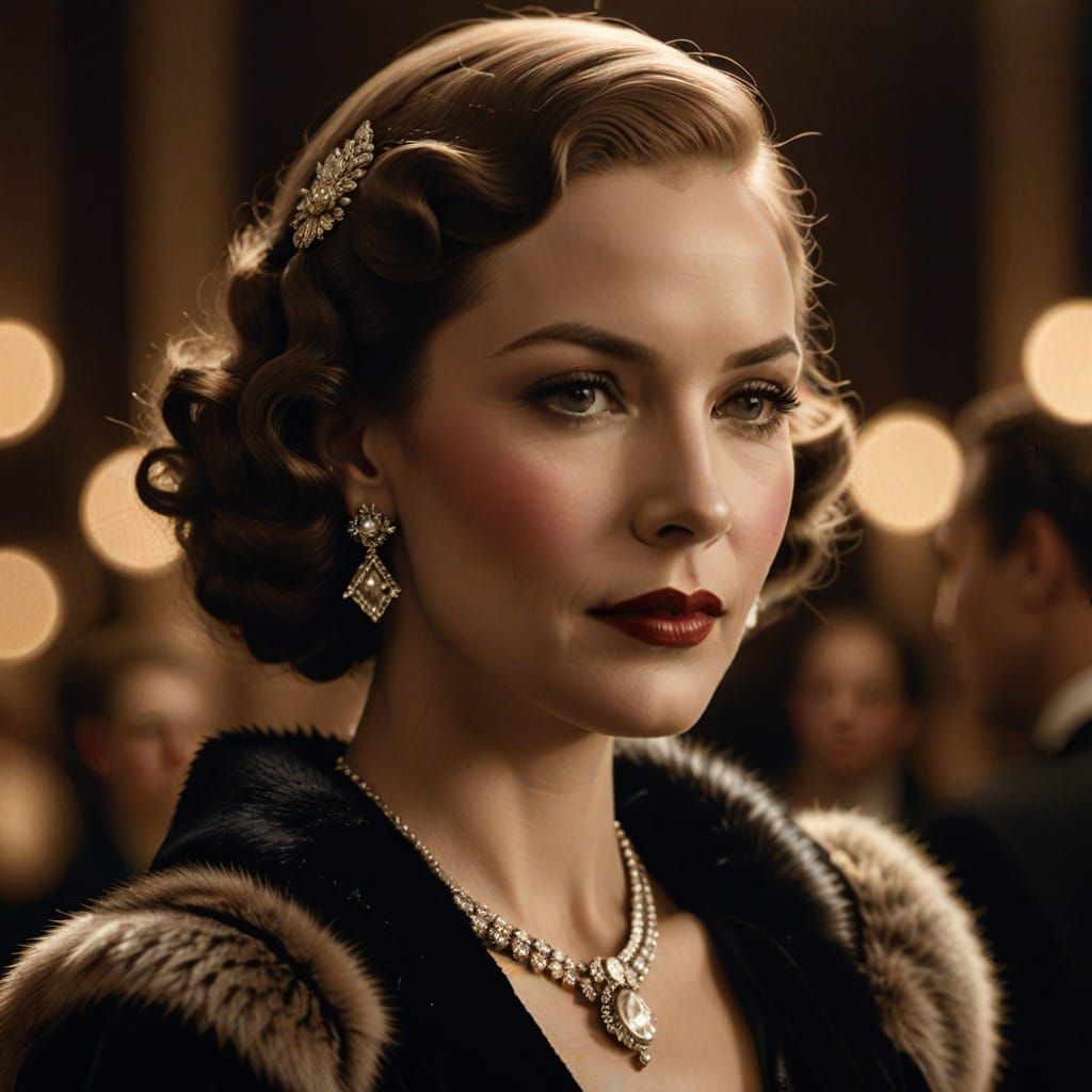 Photorealistic 1930s portrait, glamorous woman in a velvet evening dress with fur stole, diamond earrings, bold lipstick, cinematic sepia tones, soft studio lighting.