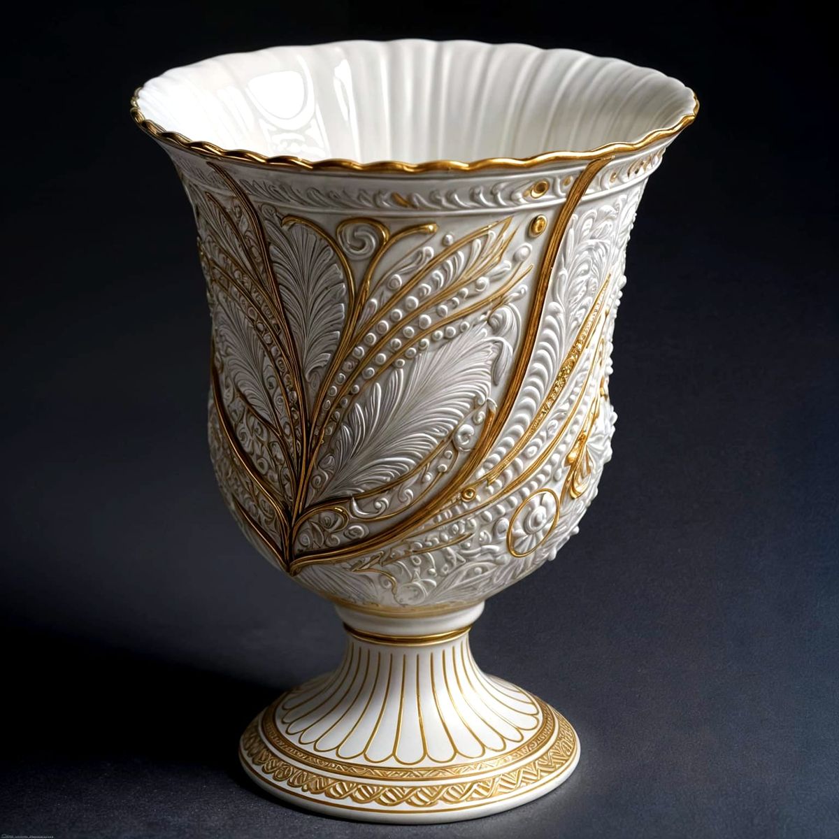 A detailed image of a decorative shell-covered vase. The vase showcases intricate detailing and is part of the Enzo de Gasperi 2024 summer collection.