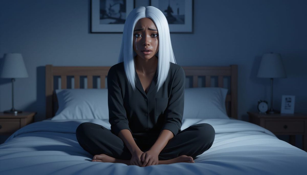 This image depicts a hyperrealistic, animated style portrait of a distressed young African woman with white hair, crying in her dimly lit bedroom. Features dramatic shading and 3D rendering.