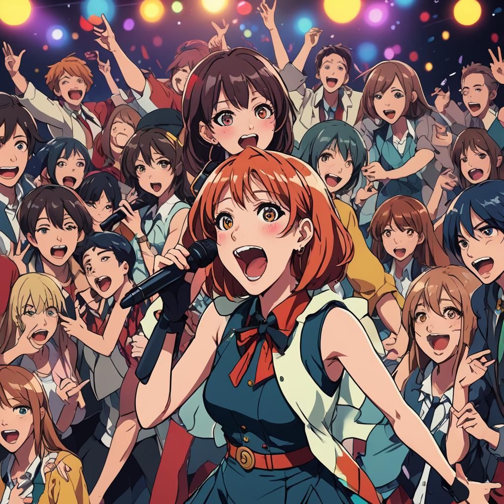 This image shows an anime-style stage performance featuring a female lounge singer. A group of people are taking a photo in the background, complete with a photobomber, rendered in vibrant colors and cel-shaded style.