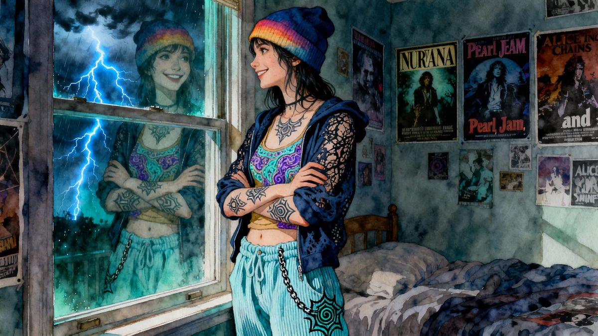 A John Blanche style watercolour of a young woman (5' 6" tall; sunset-pattern gradient indigo/mavy-blue toque; dark-indigo lace hoodie; ochre/teal/violet paisley tank-top; pale-blue baggy corduroy pants with chain; black/indigo/teal fractal tattoos; sorrowful expression) looking out a window. Her reflection ...