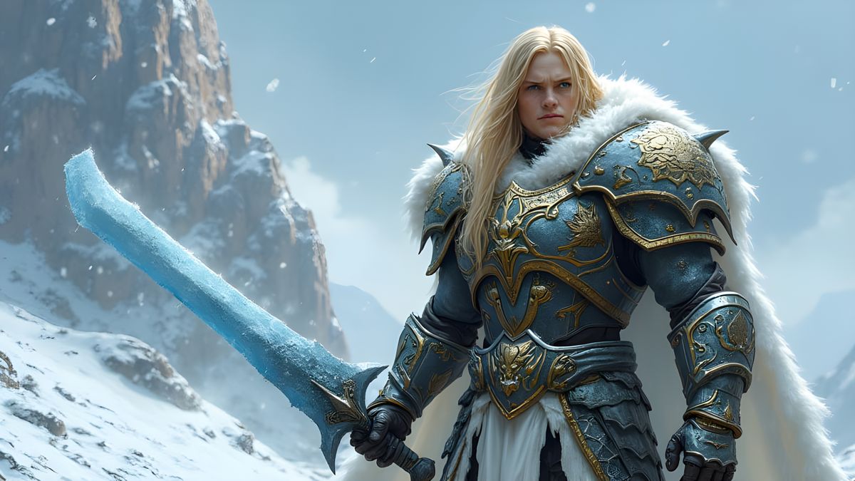 A regal warrior in intricately designed power armor stands amidst a snow-covered mountain landscape, surrounded by jagged ice formations, holding a majestic icy blue power sword and draped in a wolf pelt cape.