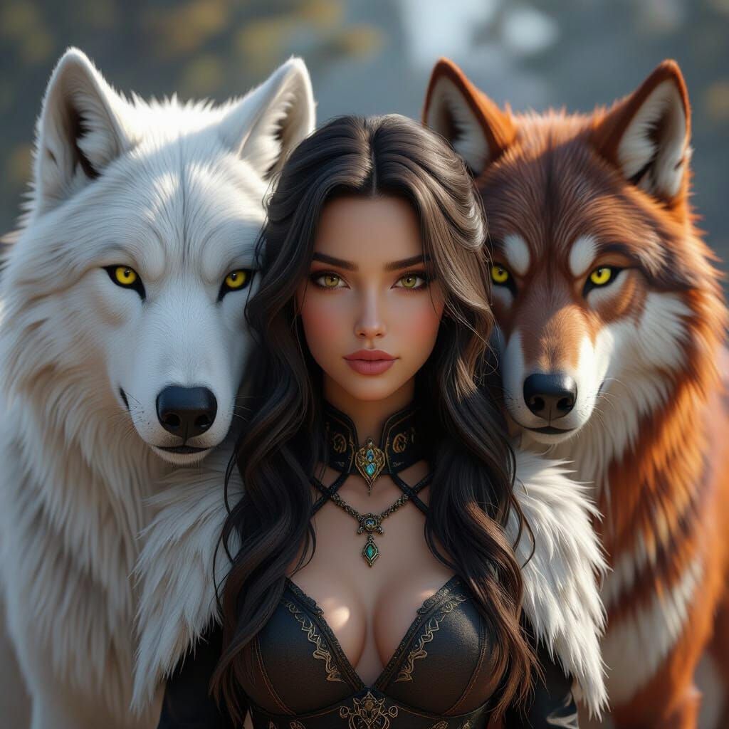 A 3D game cinematic image showing a woman with a brunette hairstyle standing between a large white wolf and a large reddish-brown wolf. Features dynamic lighting and vibrant colors.
