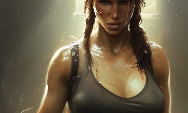 A detailed portrait of Lara Croft, face covered in ashes, in 8k resolution. Dynamic lighting and intricate details create a dramatic effect, evoking Art Nouveau paintings.