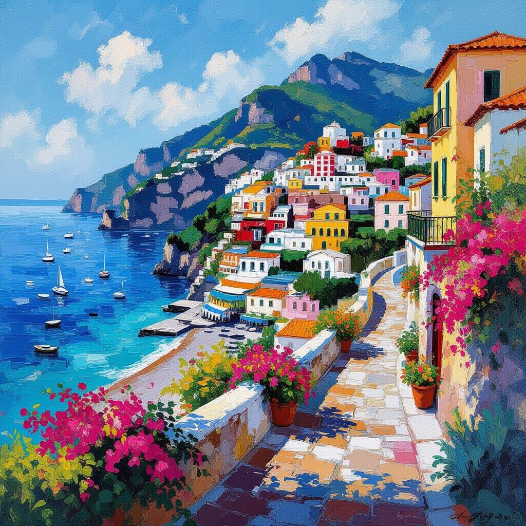 This image shows a vibrant Amalfi Coast village with colorful buildings and bougainvillea. The artwork is in an impressionistic style reminiscent of classic masters.