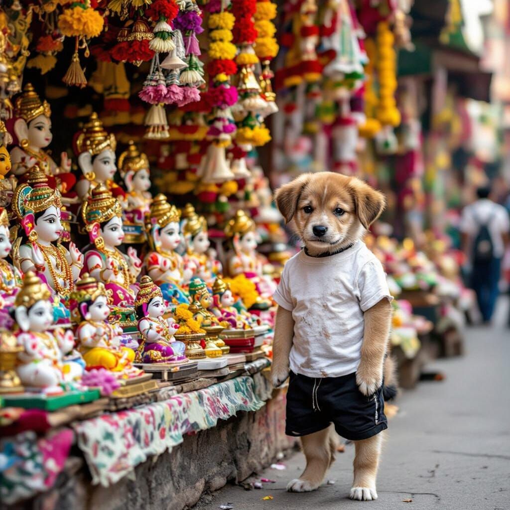 This image shows a puppy in tattered clothes standing next to a Ganpati stall in a busy street market. The scene is presented with sympathetic realism and a touch of whimsy.