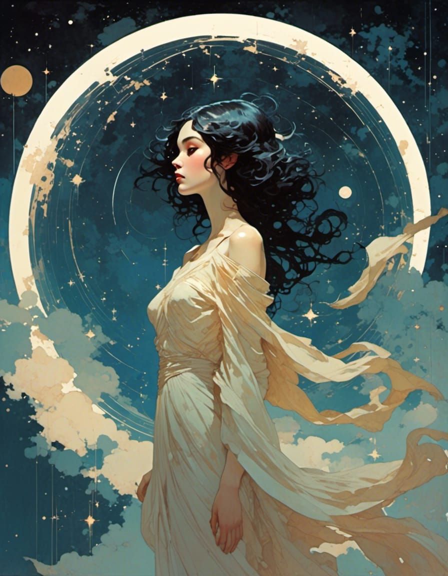 <lora:Liminal Lacquer:1.0>16k, Graphic high contrast illustration, Bbest quality, flat color, Constellation, Asterism, Celestial pattern, 1girl, Night Sky Enchantress, draped in a flowing celestial gown, her silhouette outlined by the constellation of Orion, kuvshinov, tom bagshaw, alphonse mucha, simon ...