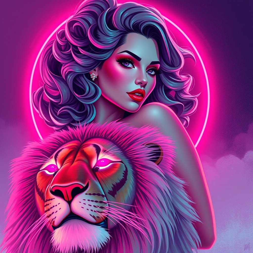 This image shows a curvaceous temptress surrounded by a halo of pink neon light, posing seductively with a majestic lion in a futuristic, cyberpunk fantasy with bold brushstrokes and a shimmering neon color palette inspired by Erté and Lee Bogle's artwork