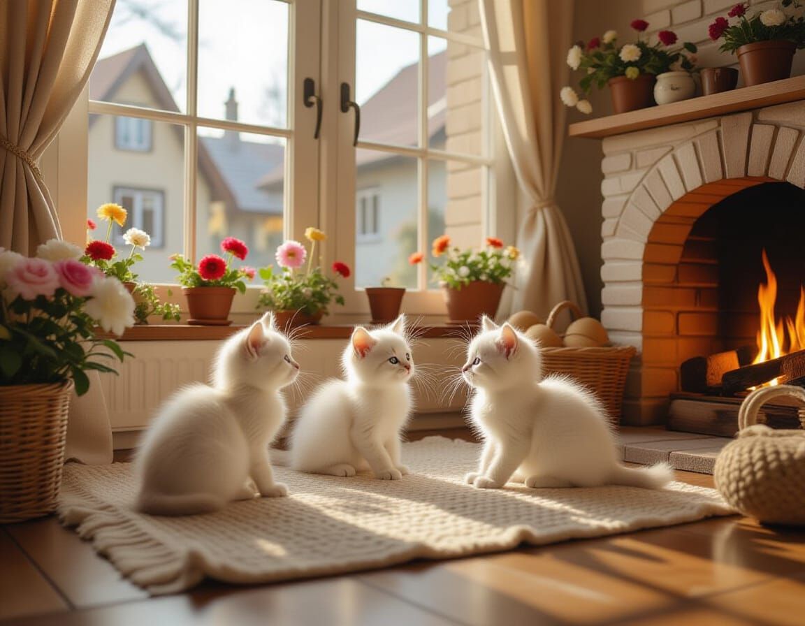 This image shows white kittens playing in a cozy village scene. The atmosphere is warm and inviting, with a fireplace, large windows displaying flowers, and cinematic lighting as a high-quality film still.