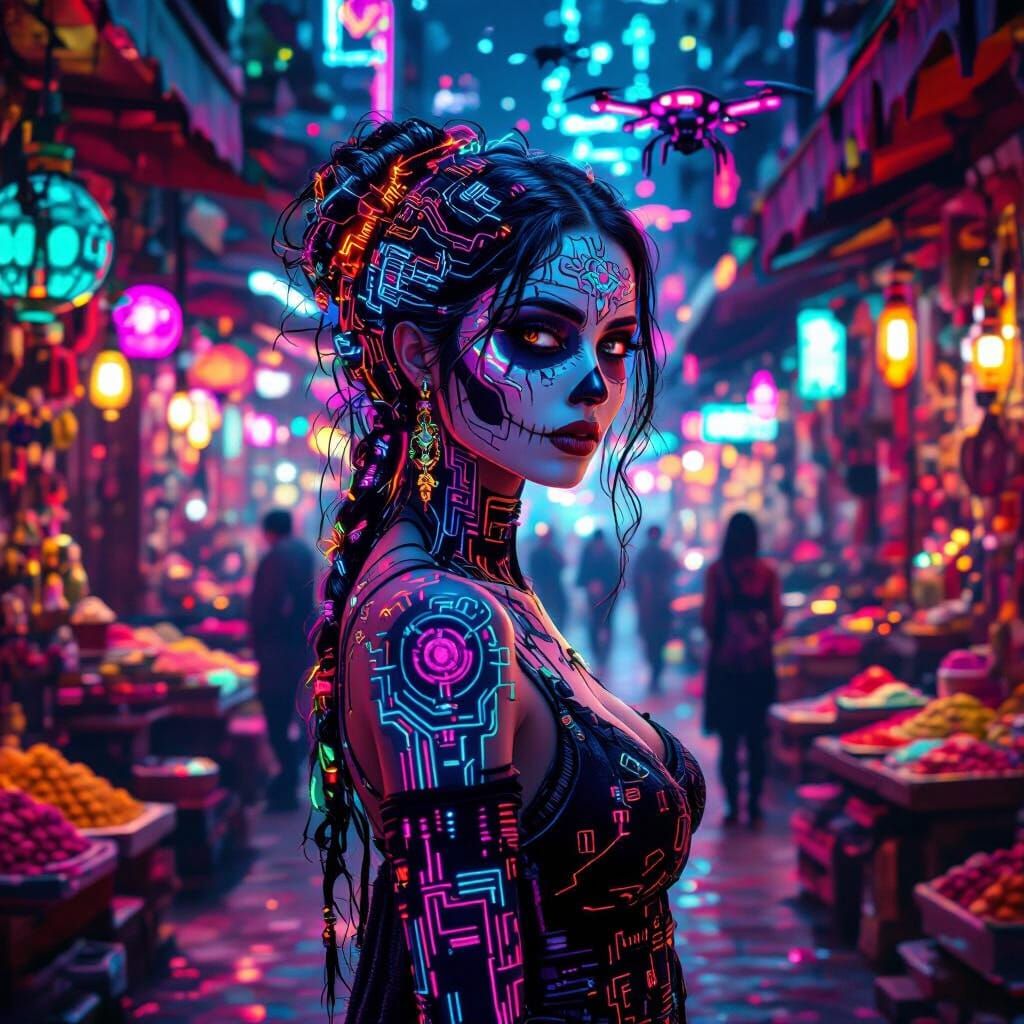 This is wild and beautiful! π The mix of Dia de los Muertos vibes with neon cyberpunk circuitry is just brilliant. The market setting adds life and contrast. Such a cool blend of tradition and futuristic edge β‘π€π Bravo!