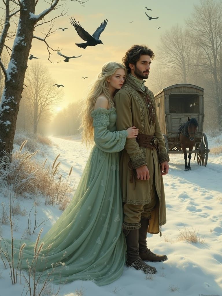 This image shows a young nobleman standing resolute in a snowy Flemish winter landscape, surrounded by a romantic and vintage-inspired scene featuring an ethereal mermaid and a majestic horse.