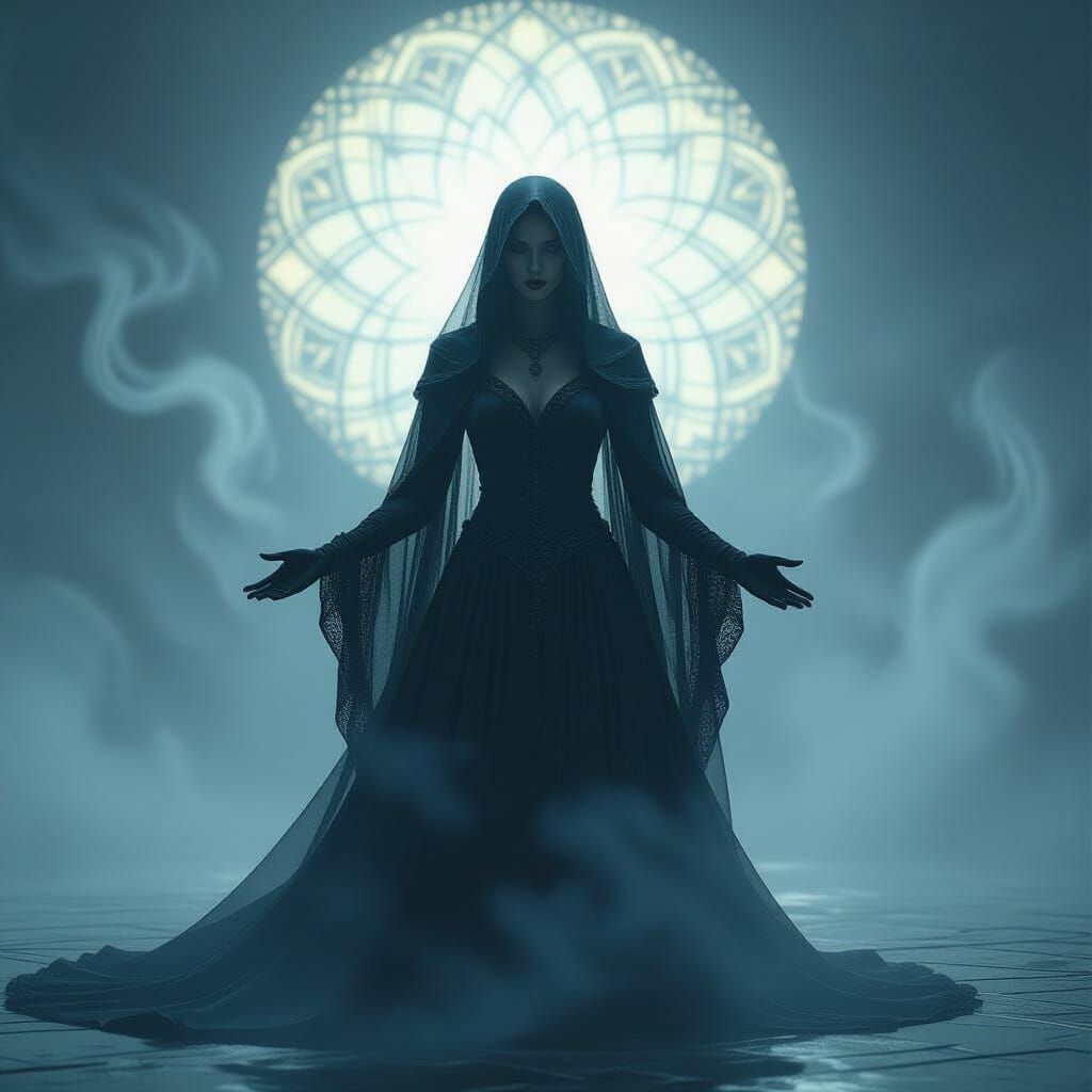 A mysterious magician woman's face is illuminated in broad daylight, set in a surreal abstract fantasy concept. Intricate patterns and mesmerizing colors create an eerie, dreamlike atmosphere.