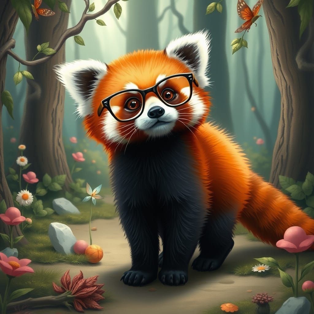 This image shows a baby red panda standing on four feet, tilting its head, and wearing big round glasses in a lush, whimsical forest setting with intricate foliage and soft, natural lighting.