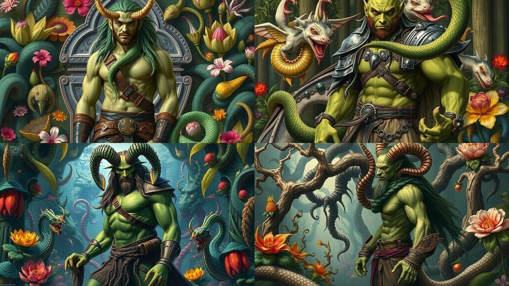 A striking picture of a muscular, green-skinned male Gorgon in leather armor, posed in a vibrant garden. The artwork evokes a surreal and intricate style similar to digital concept art.