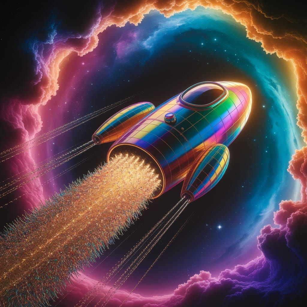 This image shows a radiant spaceship ascending through a swirling cosmic background filled with nebulae. Propelled by compressed pom-poms, it leaves a trail of rainbow hues, illuminated by warm, golden light in a retrofuturism aesthetic.