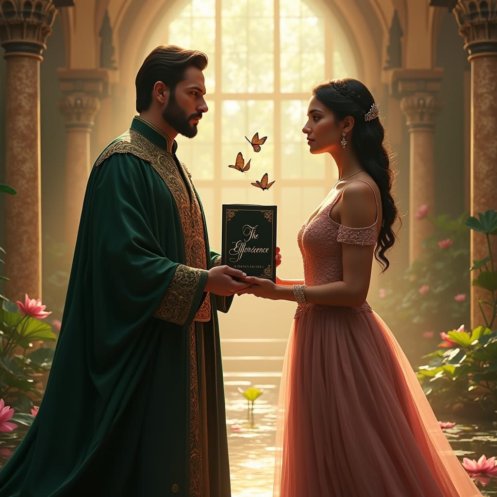 This stunning image depicts a majestic royal couple standing in a grand palace garden, surrounded by opulent details and warm sunlight. The king and queen are dressed in resplendent attire, with the king offering a leather-bound book featuring exquisite butterflies and elegant script. Majestic architectu...