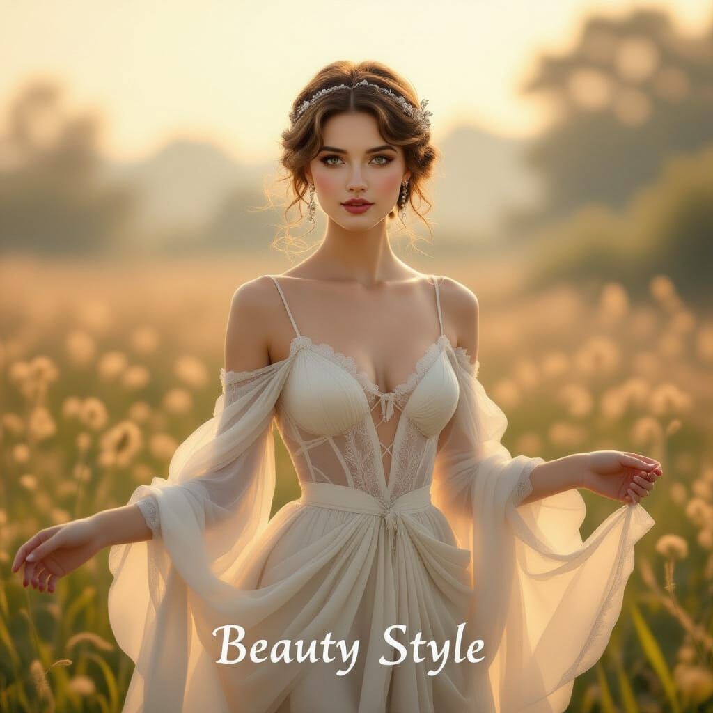 This image shows a 1925-inspired woman with flowing garments in a fantasy landscape. It features hyperdetailed elements and soft mist, rendered in a painterly style with warm, golden light.