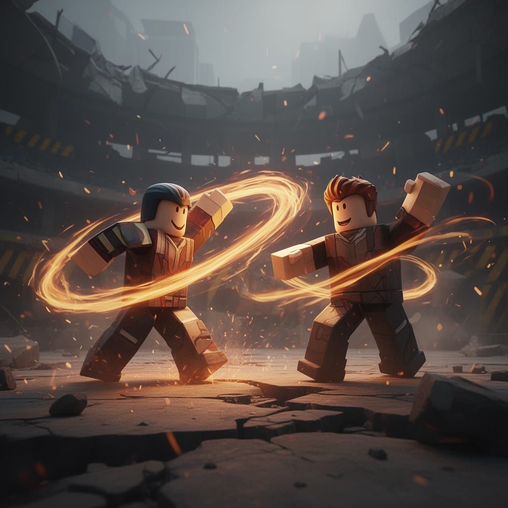 This dynamic image showcases two Roblox-style characters in intense combat within a ruined battle royale arena. Action lines and energy trails highlight the fast-paced, superhuman fight, rendered with high-contrast lighting and a stylized realism.