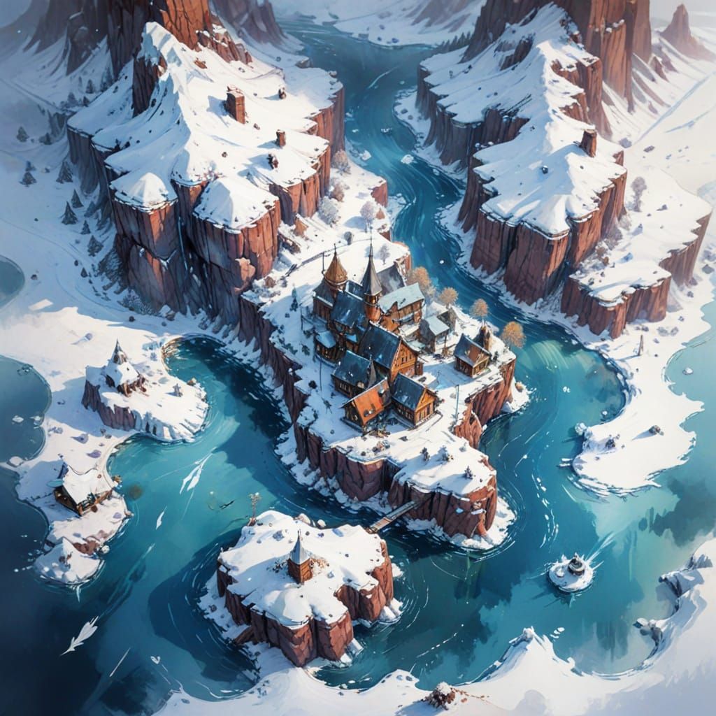 This image shows a vintage pixel-art map of a frozen tundra. The overhead RPG aesthetic features icy fjords, tiny villages, and muted colors, reminiscent of eight-bit art.