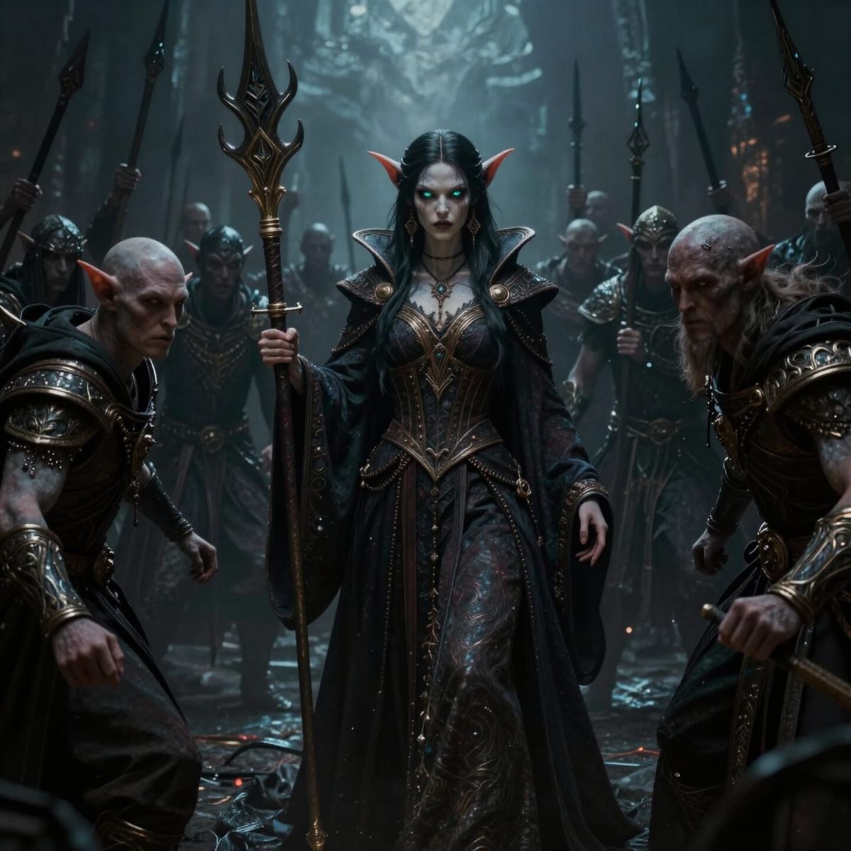 This dark fantasy concept art showcases a goblin priestess with glowing eyes leading robed followers into an epic battle. Highly detailed, cinematic lighting, and deep colors create an atmospheric scene.