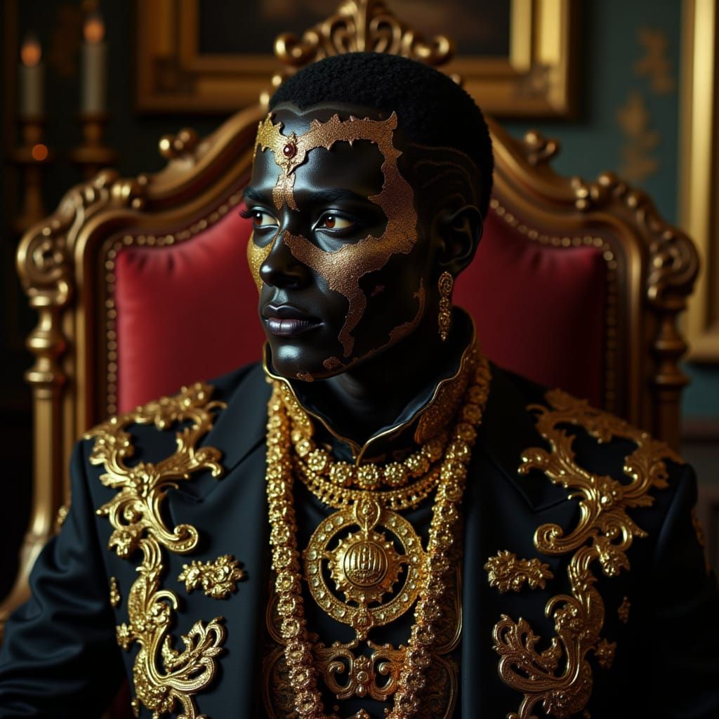 A striking picture of a nobleman with skin like black marble, featuring gold cracks and ornate clothing. The photorealistic digital art employs chiaroscuro lighting.