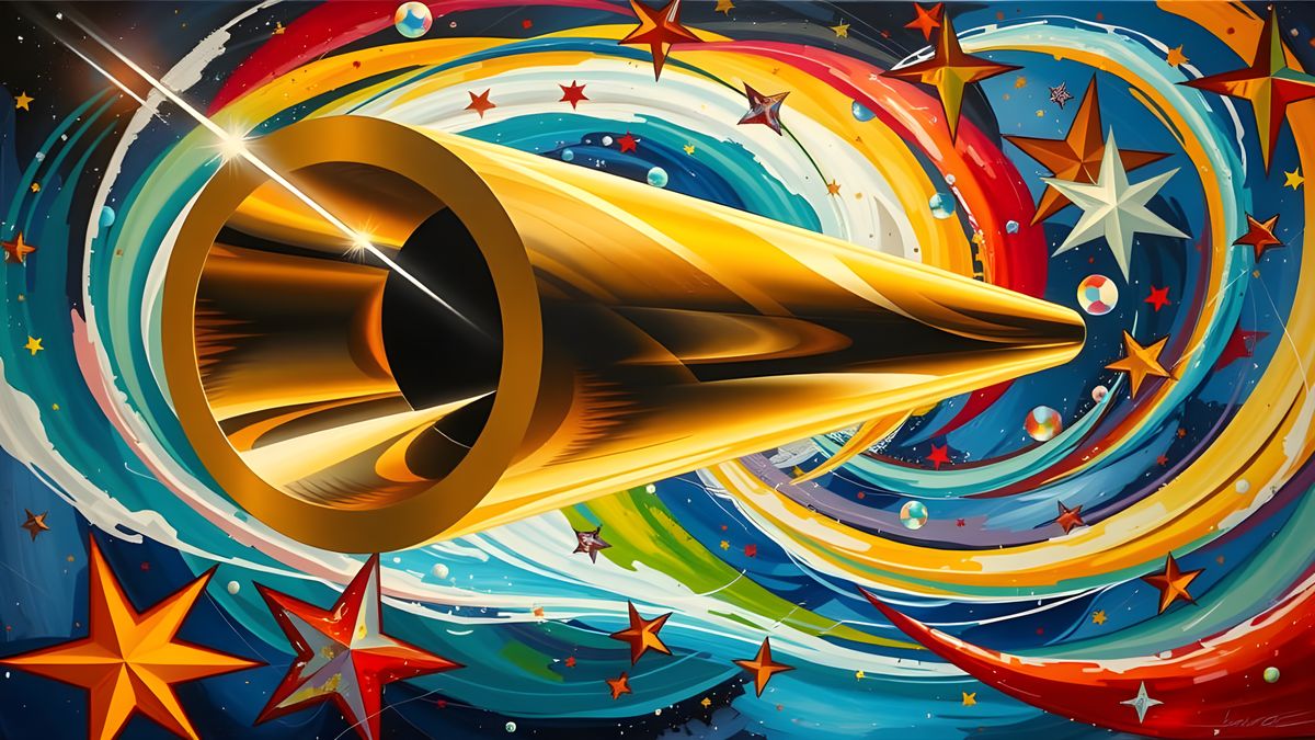 This image depicts a sleek, spinning metallic cylinder in a deep, swirling vortex of interstellar plasma, surrounded by vibrant, shimmering stars. The artwork features bold, clashing colors and dynamic brushstrokes reminiscent of abstract expressionism.