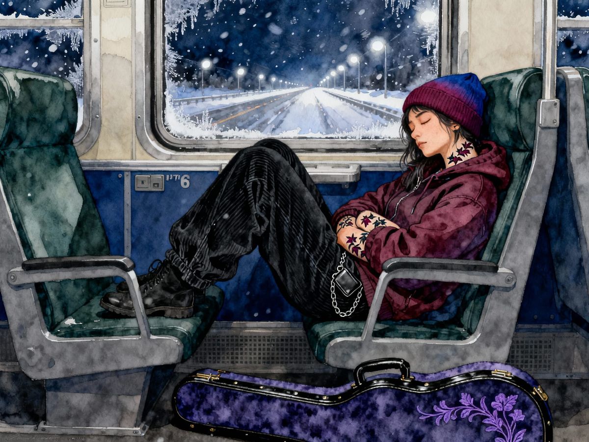 A John Blanche style watercolour side-profile of a young woman (5' 6" tall; gradient maroon/indigo toque; dark-wine/burgundy insulated-hoodie; black baggy corduroy pants with wallet-chain; black/maroon ivy-pattern wrist and collar tattoos) curled-up asleep in a passenger-train seat (dark green upholstery; ...