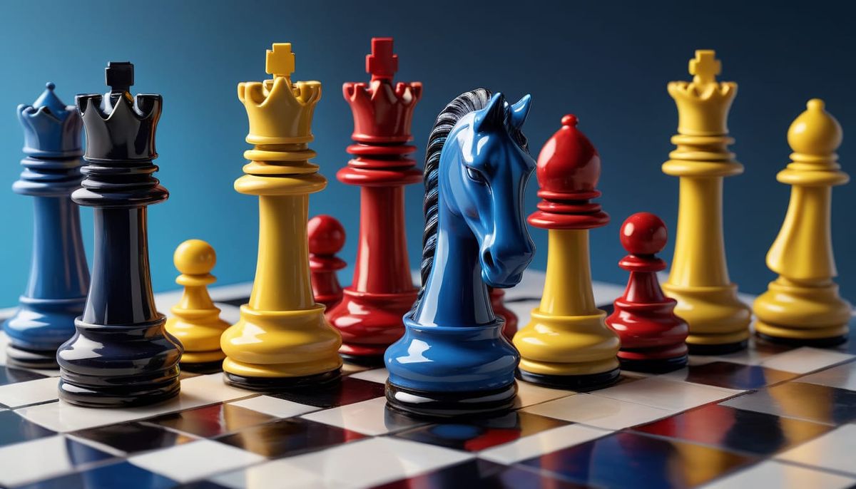 This stunning image showcases a hyperdetailed, photorealistic abstract composition in the style of Piet Mondrian, featuring a colorful chess set on a giant board with intricate details and dramatic lighting.