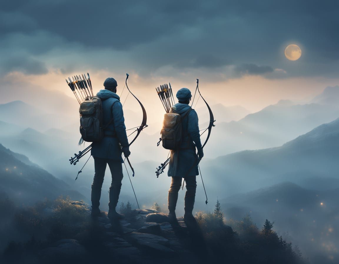 This image shows two archers standing on a misty mountain bathed in warm golden moonlight. The impressionistic style is defined by soft focus, blue and grey brushstrokes, and a dreamy, ethereal atmosphere.