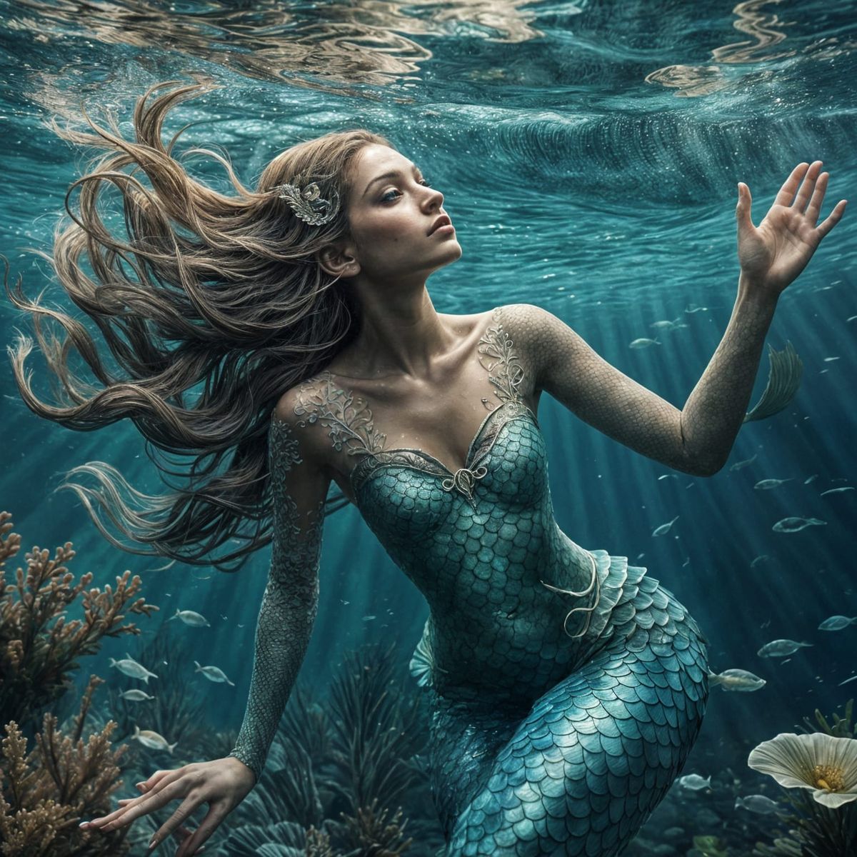 This image shows a hyperrealistic depiction of a beautiful mermaid gracefully swimming beneath the ocean's surface, with intricate details in her form and the surrounding environment.