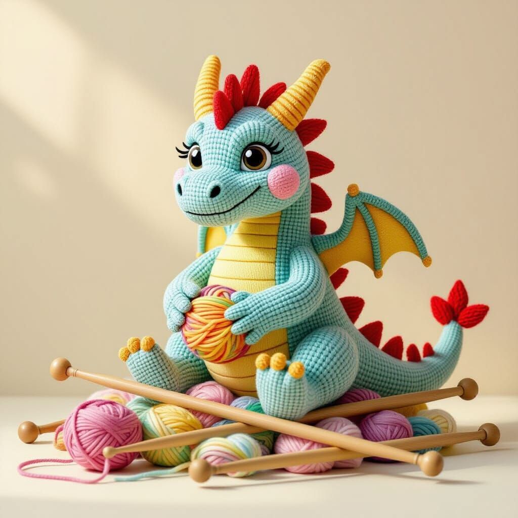 This image depicts a charming dragon crafted from knitted yarn, perched on large needles with rainbow yarn. It features soft lighting and vibrant colors, evoking a children's book illustration style.