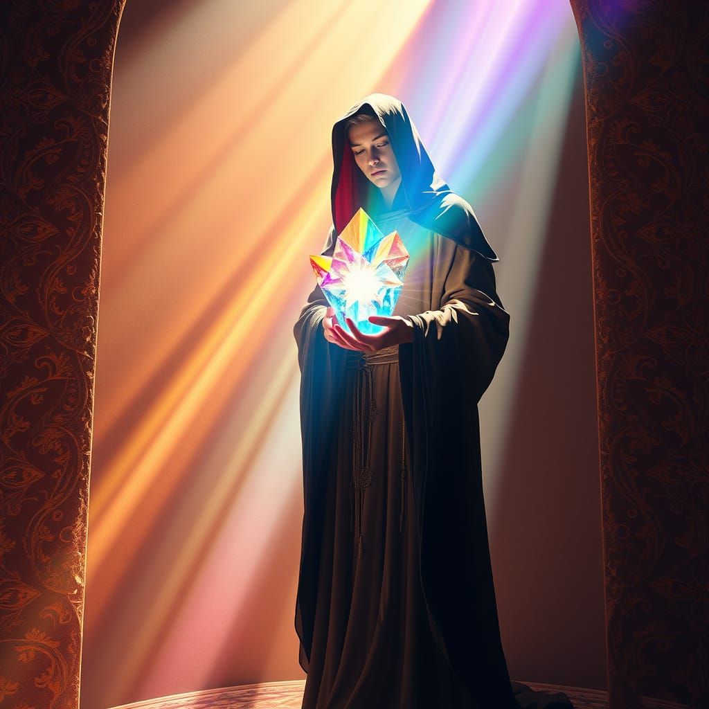 This image shows a druid holding a rainbow-encapsulated crystal. The scene features bursting kaleidoscopic colors and textured walls bathed in warm sunshine, reminiscent of art nouveau with futuristic elements.