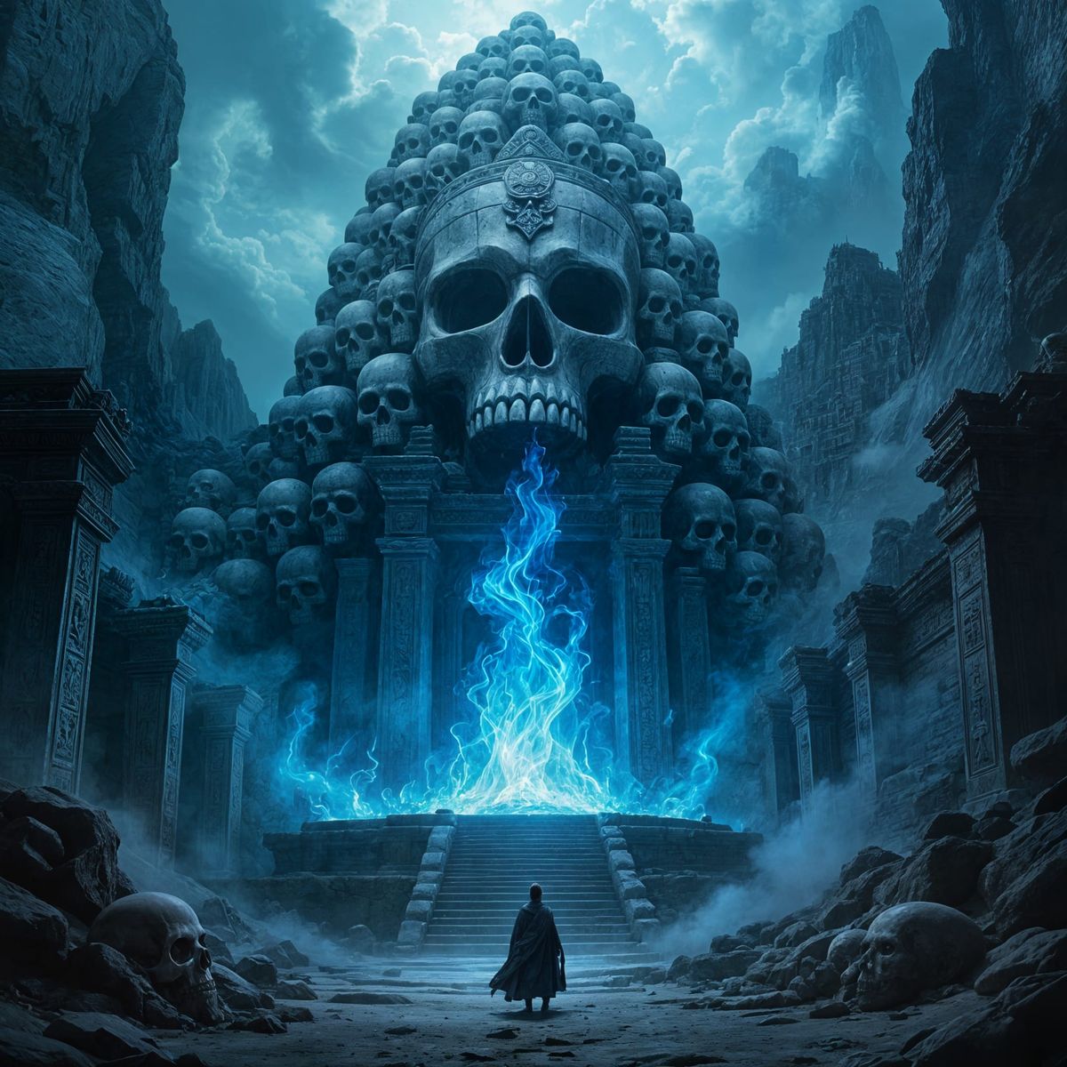This image depicts a mysterious forgotten temple intricately carved into a mountain made of skulls. Sacred blue fire burns intensely within its entrance, creating an awe-inspiring and dark scene.