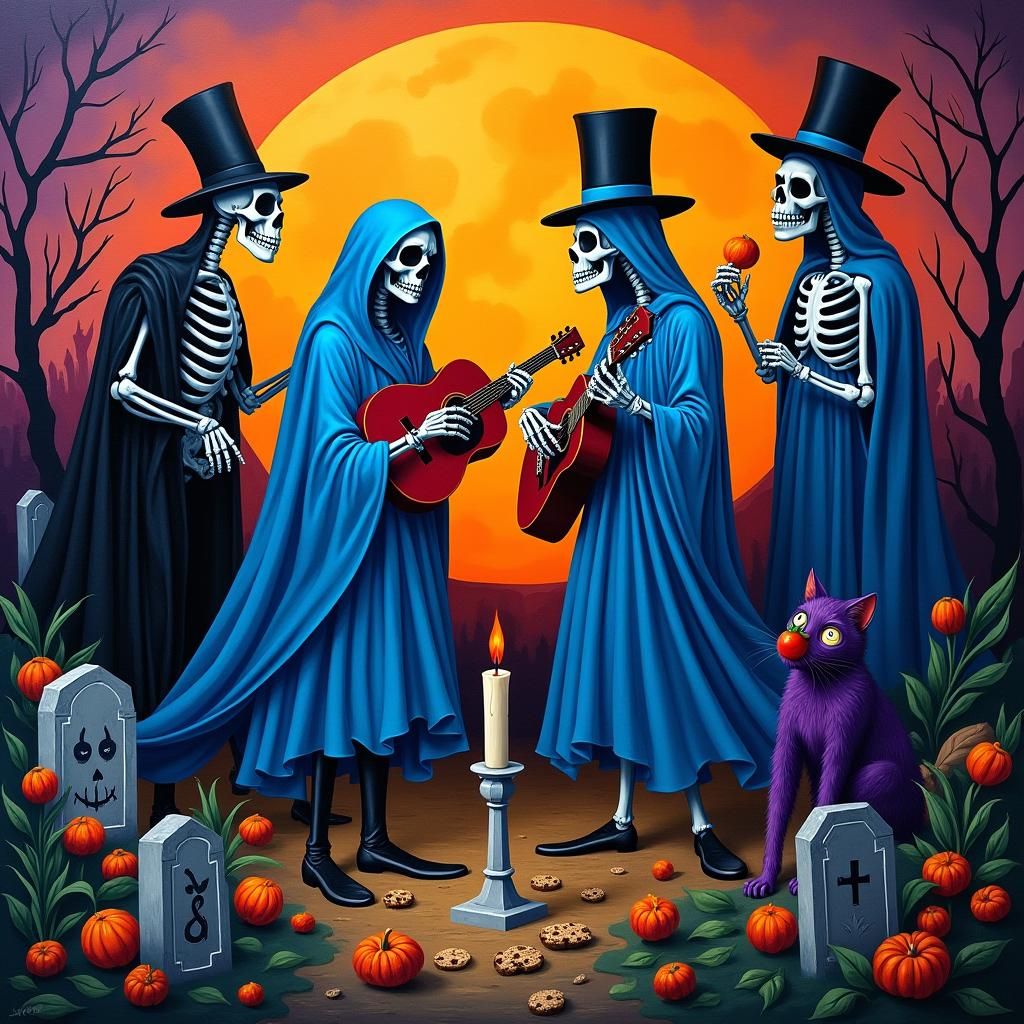 This image shows blue ghosts dancing in an orange moonlit scene, with skeletons, a purple cat playing guitar, and festive Day of the Dead elements in a cubist style.