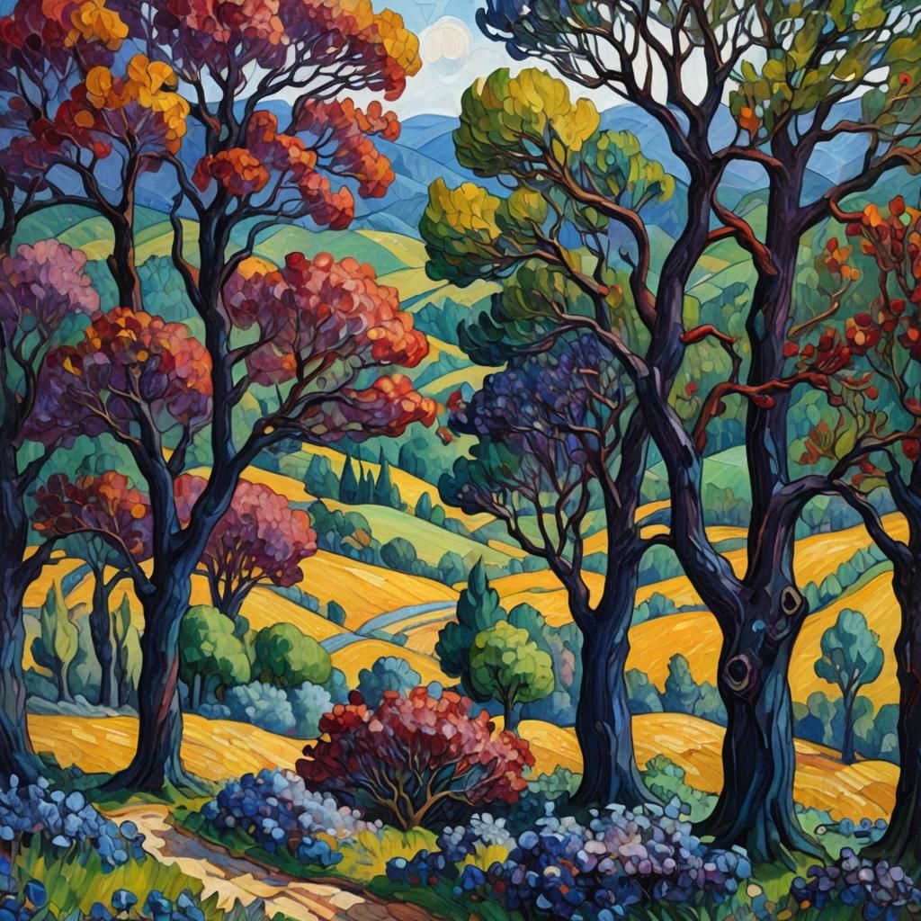 A vibrant oil painting of a triumphant figure in a landscape of hills and woods. The artwork employs thick, textured paint and expressive brushstrokes with sapphire, amethyst, and ruby colors in an expressionist style.
