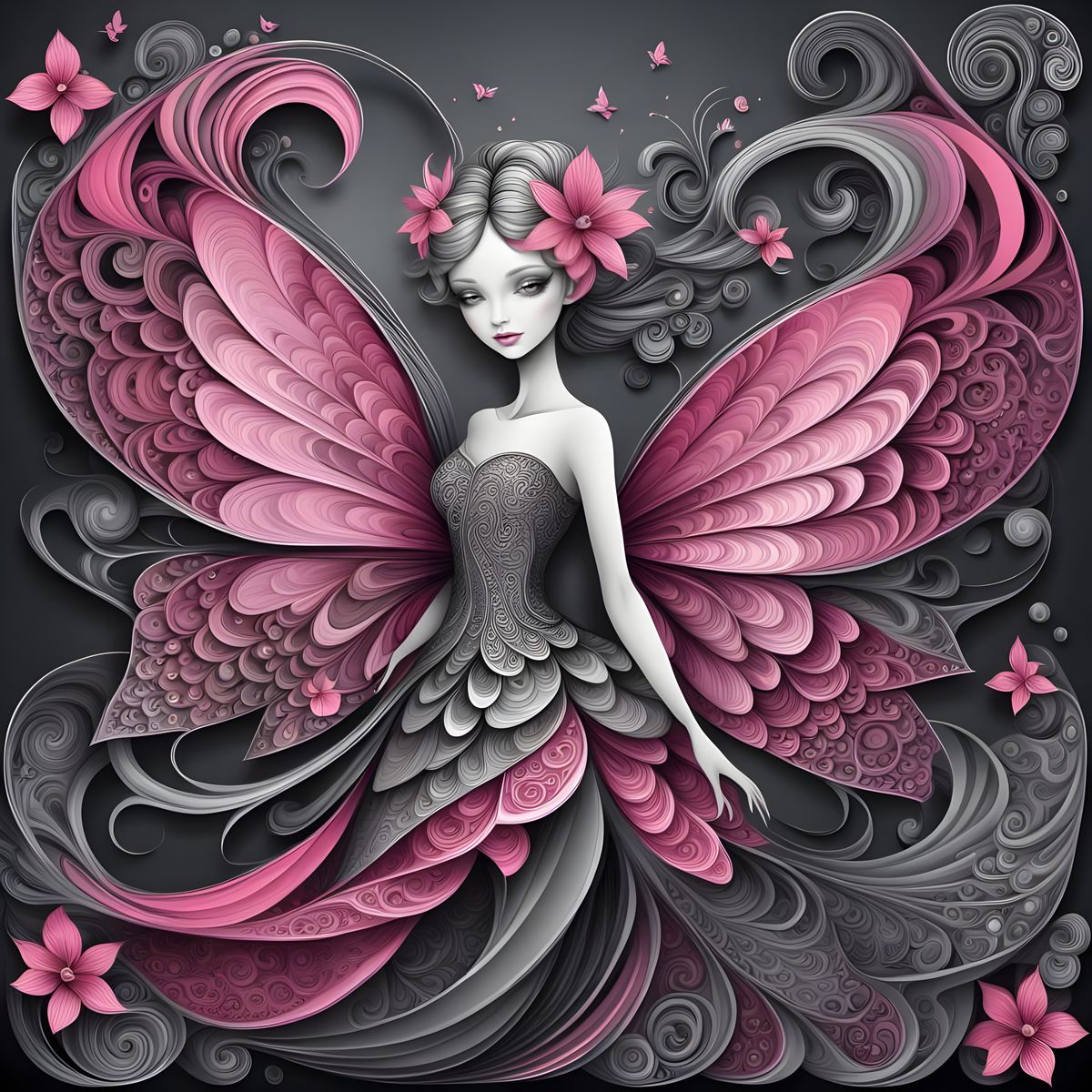 This image shows an elegant fairy in a pink and gray color palette. The fairy is depicted with intricate zentangle patterns and abstract fractal designs, with detailed 3D shading.