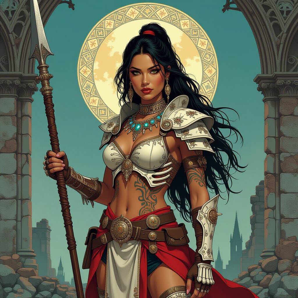 A striking picture of an androgynous warrior with tribal tattoos and bone armor, holding a spear. The background features a ruined gothic cathedral, with an ornate, vibrant, and atmospheric style.