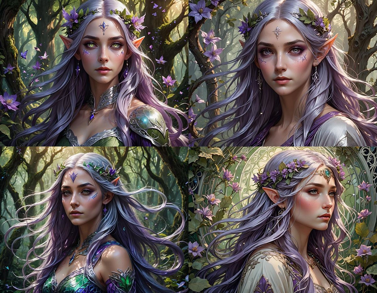 A magical elven girl with flowing silver and purple hair stands in a lush forest. She wears a nature-themed dress and has wise, purple eyes. The image features dynamic lighting and intricate details.
