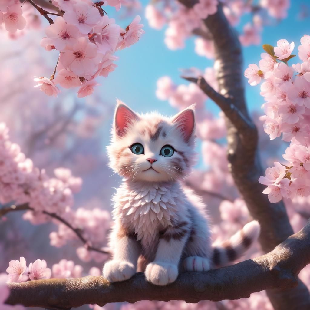 This image shows a kitten in a cherry blossom tree, rendered as 3D digital art. The pastel colors and soft lighting create a whimsical, cinematic atmosphere.