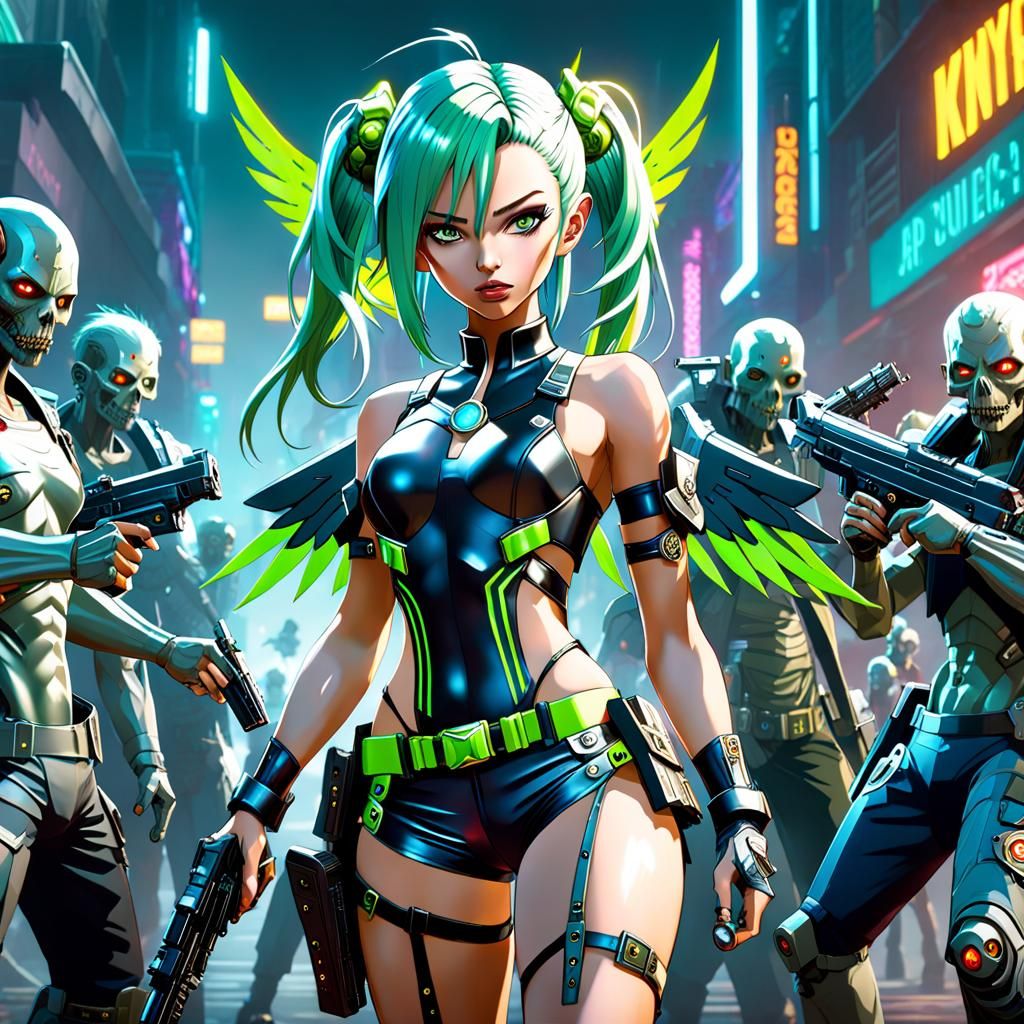 This image depicts a slender cyborg warrior with wings, clad in blue metallic armor. She holds a laser pistol amidst a zombie horde, rendered in a cyberpunk aesthetic.